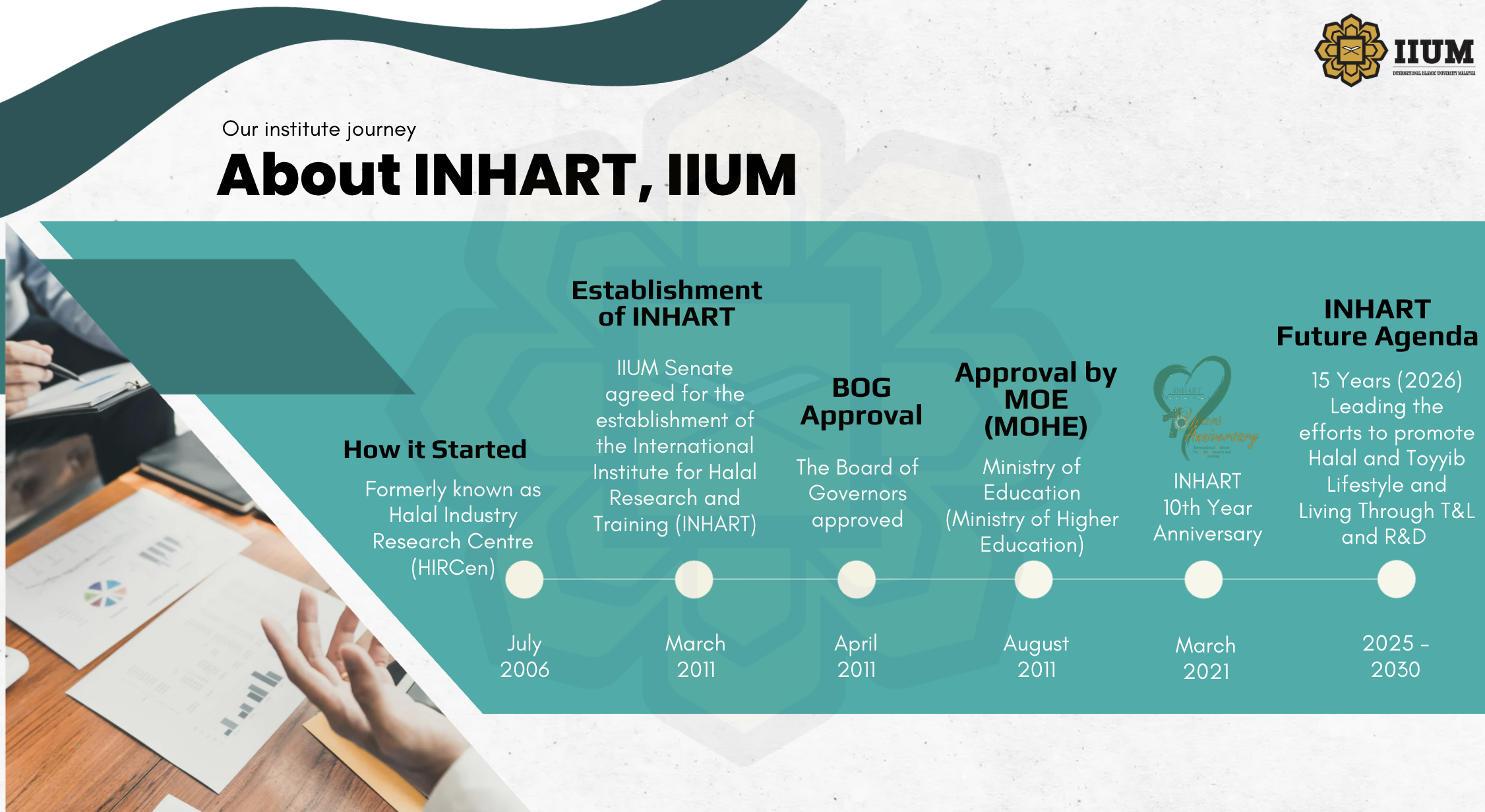The International Institute for Halal Research and Training (INHART) was established at theInternational Islamic University Malaysia by IIUM Senate (March 2011) and IIUM Majlis (April 2011) and received approval from the Ministry of Higher Education Malaysia in August 2011. INHART is a centre of excellence at the university level and strives to be a renowned entity at the national level and the international arena in the near future. INHART history begins withthe establishment of a special centre dedicated to halal industry – “IIUM Halal Industry Research Centre (HIRCen)” in July 2006. Prior to the birth of this centre, there were already pockets of activities related to the halal and halal industry by academic staff from various Kulliyyahs. But with HIRCen, halal-related activities at IIUM become more focused and better coordinated with the Research Management Centre becoming the monitoring body.
