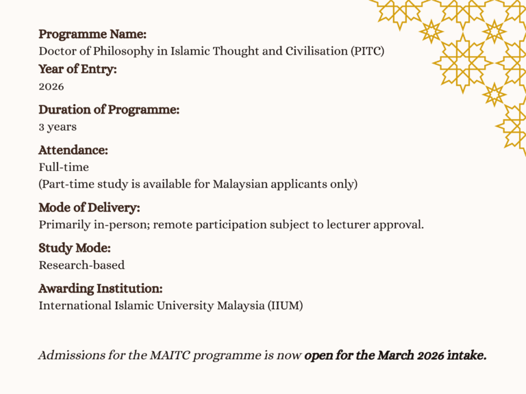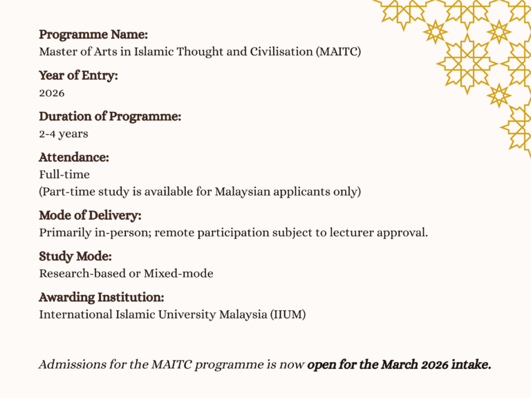 Published biannually in June–July and November–December, Al-Shajarah serves as a sustained forum for reflective inquiry rooted in tradition yet responsive to the present. Manuscripts and all correspondence should be addressed to the Editor-in-Chief, Al-Shajarah, Research and Publication Unit, International Institute of Islamic Thought and Civilisation (ISTAC), International Islamic University Malaysia (IIUM), F4 Building, No. 24, Persiaran Tuanku Syed Sirajuddin, Taman Duta, 50480 Kuala Lumpur, Malaysia.