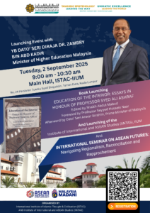 International Seminar on ASEAN Futures: Navigating Regionalism, Reconciliation, and Rapprochement, in which YB Dato’ Seri Diraja Dr. Zambry Abd Kadir., Minister for Higher Education will attend as the guest of honour, to deliver Keynote Address: “ASEAN’s Strategic Horizon In a Fragmented World” speech of YAB Dato’ Seri Anwar Bin Ibrahim, Prime Minister of Malaysia followed by launching the book “Education of the Interior: Essays in Honour of Prof. Syed Ali Ashraf”, which includes an afterword by YAB Prime Minister, and conclude with launching of IIUM’s new institute, the Institute of International and ASEAN Studies (IINTAS).