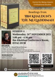 READINGS FROM IBN KHALDUN’S THE MUQADDIMAH – SESSION 4Date: 26th November 2025 (Wednesday)Time: 3:00 pm – 4:30 pmVenue: Ibn Khaldun Conference Room, ISTAC-IIUM