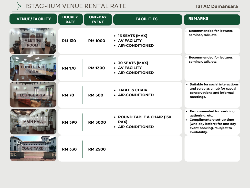 PLEASE EMAIL THE REQUIRED INFORMATION TO BOOK YOUR VENUE(S) AT ISTAC USING THE OFFICIAL EMAIL ADDRESS: istac@iium.edu.my